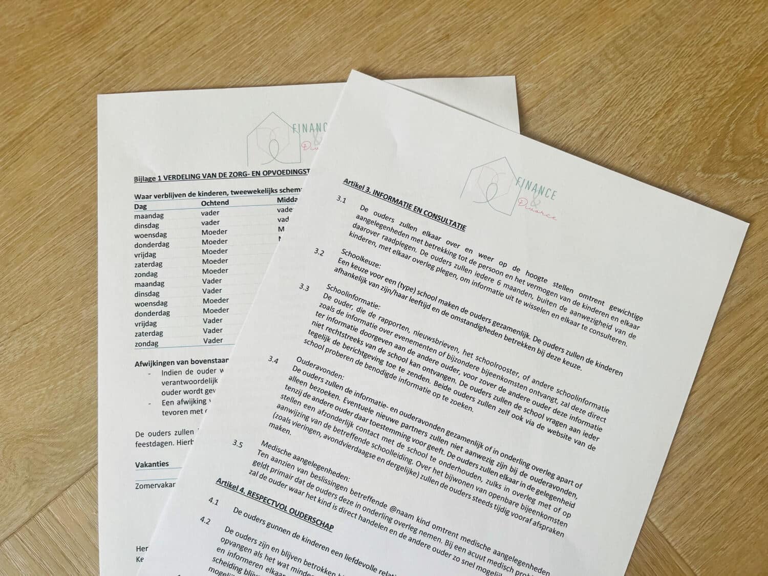 Hierin leggen jullie vast hoe de zorg en opvoeding worden verdeeld. Denk aan afspraken over bij welke ouder je kind verblijft, hoe vakanties, feestdagen en bijzondere gelegenheden worden geregeld. Zo hebben zowel jullie als je kind een helder overzicht.